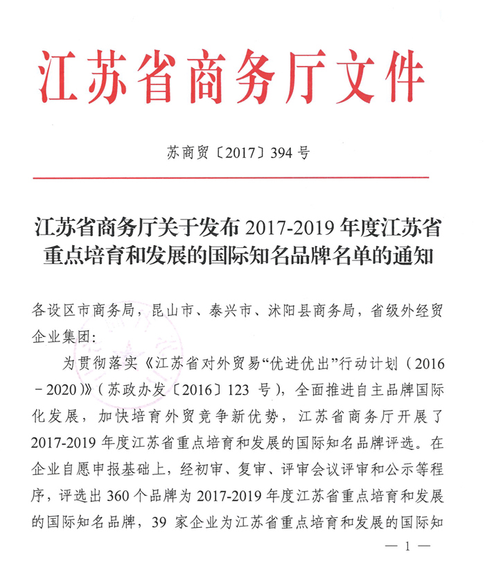近日,省商務(wù)廳公布“2017-2019年度江蘇省重點培育和發(fā)展的國際知名品牌”名單,經(jīng)過層層評比,江蘇鵬飛集團(tuán)榮膺在列。