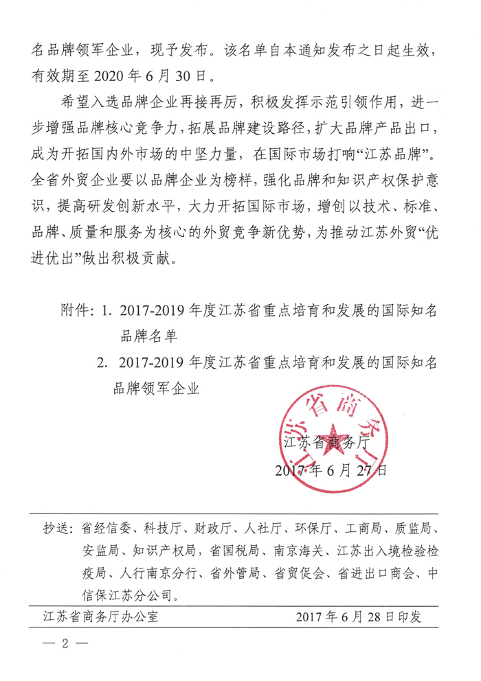 “鵬飛”入選江蘇省重點培育國際知名品牌名單