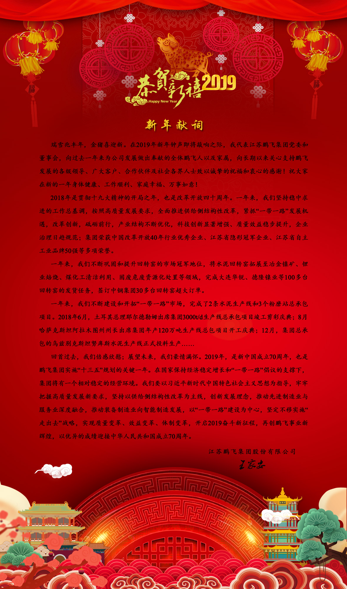瑞雪兆豐年,金豬喜迎新。在2019年新年鐘聲即將敲響之際,我代表江蘇鵬飛集團黨委和董事會,向過去一年來為公司發(fā)展做出奉獻的全體鵬飛人以及家屬,向長期以來關(guān)心支持鵬飛發(fā)展的各級領導、廣大客戶、合作伙伴及社會各界人士致以誠摯的祝福和衷心的感謝!祝大家在新的一年身體健康、工作順利、家庭幸福、萬事如意!