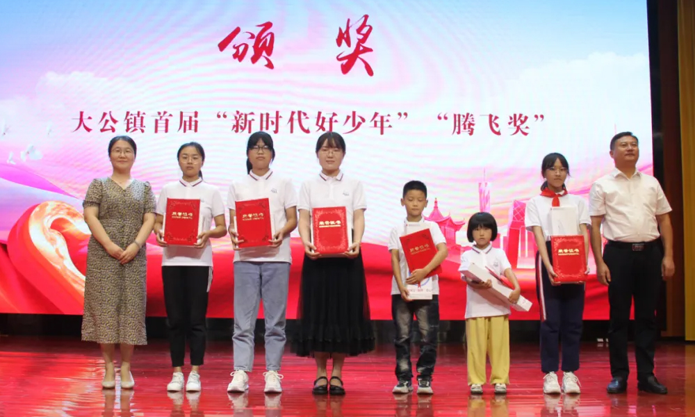 海安市委宣傳部未成年人思想道德建設(shè)科科長奚海寧、大公鎮(zhèn)人大主席王軍共同為大公鎮(zhèn)首屆“新時(shí)代好少年”“騰飛獎”獲得者頒獎,并送上禮品。