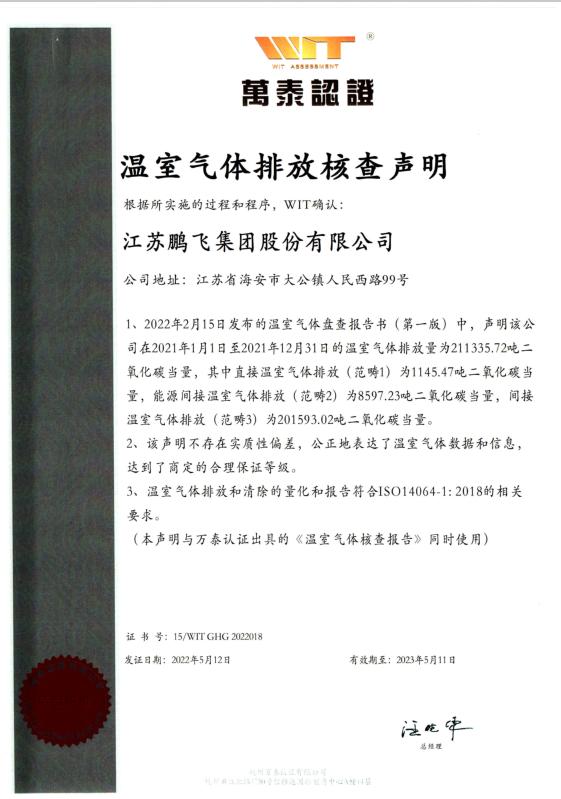 江蘇鵬飛集團(tuán)股份有限公司一直以來(lái)堅(jiān)持綠色采購(gòu),綠色生產(chǎn),綠色物流的原則,積極響應(yīng)并參與相關(guān)方(政府、客戶(hù)等)節(jié)能降排、碳排放報(bào)告活動(dòng)。