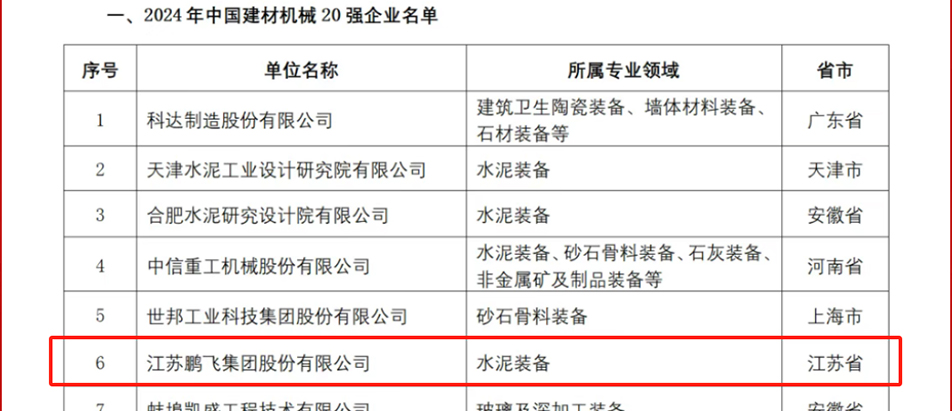 鵬飛集團(tuán)榮獲“2024年中國建材機(jī)械20強(qiáng)企業(yè)”、“2024年中國建材機(jī)械專業(yè)龍頭企業(yè)”
