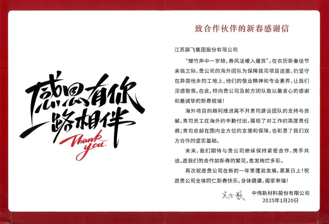 江蘇鵬飛集團(tuán)在項(xiàng)目履約中用行動(dòng)做到客戶滿意,以優(yōu)質(zhì)履約作為品牌支撐,收到來(lái)自客戶的感謝信。信中,客戶對(duì)我司交付的項(xiàng)目質(zhì)量和效率表達(dá)了高度肯定和認(rèn)可,更對(duì)鵬飛項(xiàng)目負(fù)責(zé)團(tuán)隊(duì)的認(rèn)真負(fù)責(zé)態(tài)度、專業(yè)技術(shù)能力、高效執(zhí)行能力給予了高度的評(píng)價(jià)和贊賞。