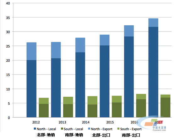 上圖展現(xiàn)了巴基斯坦國內(nèi)水泥行業(yè)的現(xiàn)狀,巴基斯坦的年度水泥消費(fèi)量從2012年的3310萬噸增長到了2017年的4280萬噸,增長幅度在30%左右,其中五分之四的水泥消費(fèi)集中在巴基斯坦的北部地區(qū)。與此同時(shí),更重要的是,巴基斯坦的出口水泥從2013年的830萬噸降低到了2017年的420萬噸。造成這一現(xiàn)象的主要原因是阿富汗市場的下跌,以及水性熟料出口量的減少??紤]到南方市場的出口水泥比例較高,盡管水泥總消費(fèi)量在增長,但是出口量的減少對南方可能會造成更大的打擊。2018年到目前為止,類似的趨勢依然存在,唯一有所改變的是南方熟料出口量的在今年有反彈的跡象。