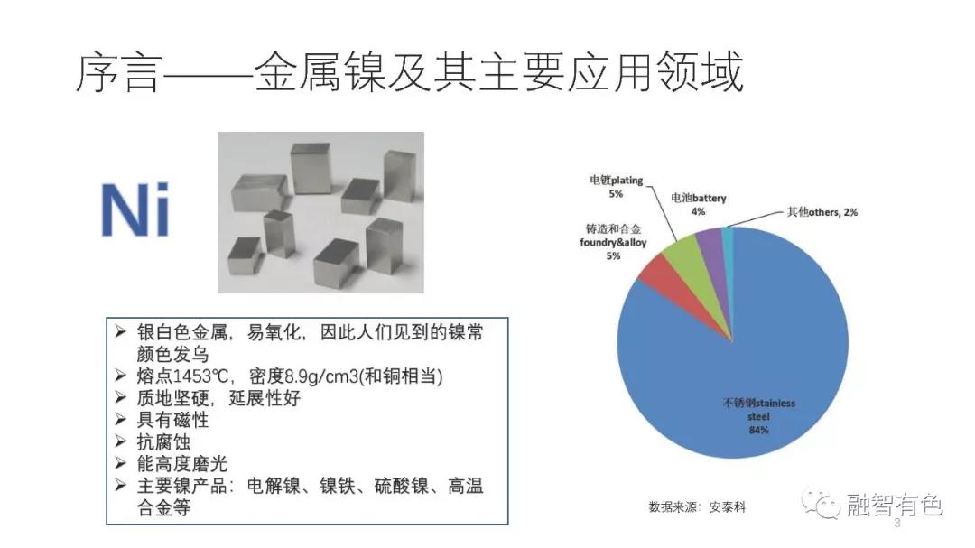 按:金屬鎳是一種性質(zhì)優(yōu)異的基礎(chǔ)金屬,在不銹鋼、電鍍、鑄造及合金、動(dòng)力電池等領(lǐng)域廣泛。特別是近年來由于新能源汽車長(zhǎng)續(xù)航里程的要求,使得高鎳三元?jiǎng)恿﹄姵厥艿酱蠹业臉O力熱捧,由此又帶動(dòng)了鎳在新能源領(lǐng)域的高速增長(zhǎng),為鎳的應(yīng)用再次錦上添花。