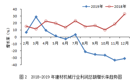 2019年,建材機(jī)械行業(yè)累計(jì)實(shí)現(xiàn)利潤總額36.57億元,同比下降31.00%,增速較上年同期回落64.26個(gè)百分點(diǎn),落后于建材工業(yè)(15.6%)、機(jī)械工業(yè)(-4.53%)的增速,遠(yuǎn)低于建材機(jī)械相關(guān)領(lǐng)域工程機(jī)械(16.48%)、重型礦山機(jī)械(21.65%)增速。從增速變化趨勢看(見圖2),全年利潤總額增速下行態(tài)勢明顯,且與上年相比回落較大,降幅最高達(dá)64.26個(gè)百分點(diǎn)。