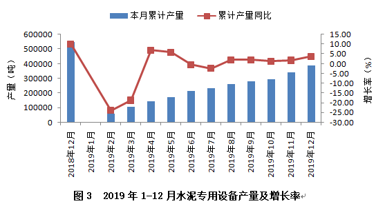 從行業(yè)重點(diǎn)監(jiān)測的產(chǎn)品看,水泥專用設(shè)備產(chǎn)量實(shí)現(xiàn)小幅增長,2019年累計(jì)完成38.65萬噸,同比增長3.69%,較上年同期下降6.37個(gè)百分點(diǎn)。從全年產(chǎn)量增速變化趨勢看(見圖3),上半年波動(dòng)較大,下半年逐步趨緩、趨穩(wěn)。