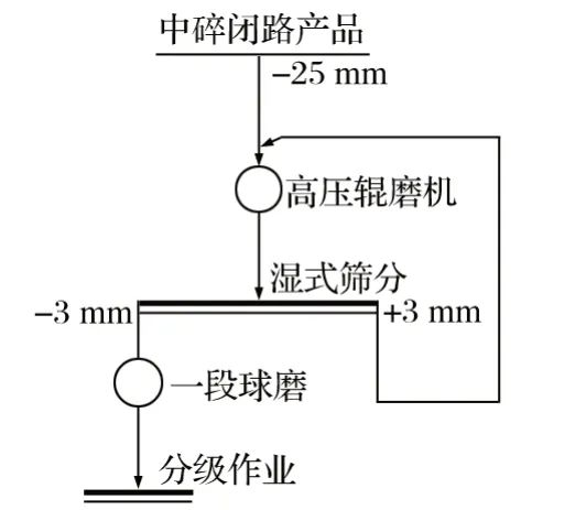 該鉬礦選礦廠從建成投產(chǎn)以來,處理礦石的性質(zhì)變化較大,經(jīng)常導(dǎo)致破碎和磨礦系統(tǒng)處理能力波動,當(dāng)處理難碎磨礦石時,系統(tǒng)處理能力低,襯板磨損嚴(yán)重。借鑒其他鉬礦選礦廠技術(shù)改造的生產(chǎn)實踐經(jīng)驗,在三段一閉路流程后引入高壓輥磨機作為超細碎設(shè)備降低入磨粒度,提高系統(tǒng)整體碎磨能力。根據(jù)大量的文獻報道,有色金屬選礦廠高壓輥磨生產(chǎn)實踐選用3 種典型工藝流程,如圖 1~ 3 所示。結(jié)合本項目特點,高壓輥磨機入料粒度為 -25 mm。