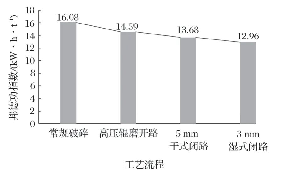 (2) 通過 3 種工藝流程產(chǎn)品功指數(shù)測定分析發(fā)現(xiàn),不同粒度閉路流程不僅影響產(chǎn)品粒度,還影響產(chǎn)品球磨邦德功指數(shù),3 mm 濕式閉路比 5 mm 干式閉路功指數(shù)降低 0.72 個百分點,可進一步改善礦石可磨性,降低一段磨礦能耗。