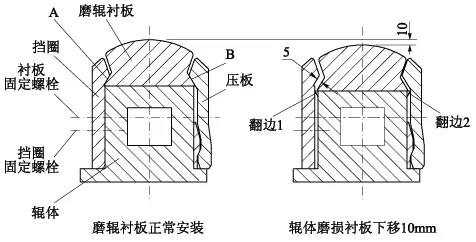 利用庫滿停機(jī)檢查,發(fā)現(xiàn)有一塊磨輥襯板的2條固定螺栓松動(dòng),緊固螺栓后用撬杠仍可以撬動(dòng)襯板。此時(shí)分析認(rèn)為可能是這塊襯板與輥體接觸面處出現(xiàn)較大磨損、變形,襯板固定不牢固。用塞尺測(cè)量接觸面A、B處間隙,B處接觸面符合要求,A處有5mm間隙。拆開襯板后發(fā)現(xiàn),該襯板下面的輥體磨去10mm左右,輥體在靠擋圈側(cè)及壓板側(cè)分別形成寬約5mm及25mm的翻邊(見圖1中翻邊1及翻邊2)。其他11塊襯板及對(duì)應(yīng)的輥體正常。由上述檢查可知,輥體表面的磨損及翻邊造成了襯板固定不牢固。