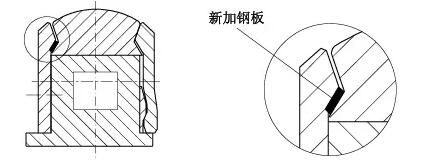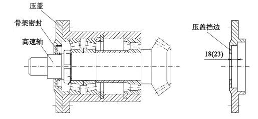 骨架密封厚度15mm,拆下壓蓋用車床將骨架密封擋邊車薄5mm,壓蓋密封槽深度由18mm加深到23mm(見圖4)。此法使得骨架密封在高速軸上的安裝位置向外移動(dòng)5mm,避開高速軸上的溝槽。經(jīng)此處理,解決了漏油問題,可以正常生產(chǎn),等到計(jì)劃?rùn)z修停機(jī)時(shí),再徹底處理高速軸上的溝槽。