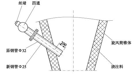 常規(guī)解決方法是打掉原Φ32鋼管周圍澆注料后更換原Φ32鋼管,這需要長(zhǎng)時(shí)間停窯。我們采取了應(yīng)急處理: