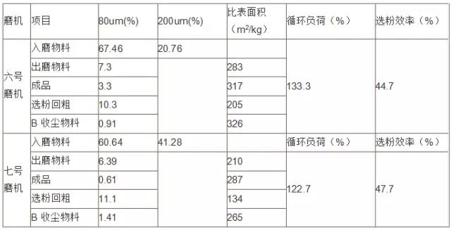 2、同時(shí)對(duì)六七號(hào)磨機(jī)的入磨物料、出磨物料、選粉機(jī)回粗、B收塵的物料、水泥成品、在磨機(jī)運(yùn)轉(zhuǎn)正常的情況下進(jìn)行取樣,做80um、200um、及比表面積以計(jì)算磨機(jī)的循環(huán)負(fù)荷和選粉機(jī)的選粉效率。測(cè)量結(jié)果見下表: