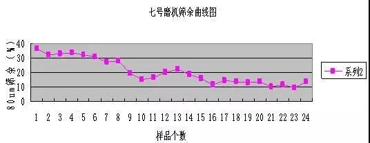 圖一 七號(hào)磨機(jī)的篩余曲線 1~8號(hào)為一倉,9~24號(hào)為二倉