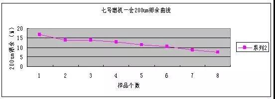 (1)從以上的兩個(gè)趨勢(shì)圖可以看出七號(hào)磨機(jī)的一倉粉磨能力還可以,特別是200um的篩余趨勢(shì)圖,篩余下降明顯。說明一倉鋼球級(jí)配和理粉磨能力正常。