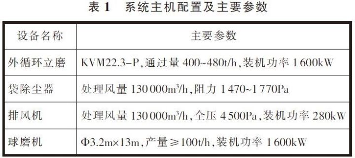 改造后的系統(tǒng)主機(jī)配置及主要參數(shù)見(jiàn)表1,系統(tǒng)工藝流程見(jiàn)圖1。該系統(tǒng)與其他立磨組成的聯(lián)合粉磨系統(tǒng)相比,主要在于立磨本身的高效粉磨特殊設(shè)計(jì),另外,選粉系統(tǒng)采取高料氣比設(shè)計(jì)與操作(實(shí)際操作中V型選粉機(jī)的料氣比達(dá)5.5m3/h),實(shí)現(xiàn)選粉系統(tǒng)的最大節(jié)能化,并控制合理的入球磨機(jī)物料粒度(確保最大顆粒小于1mm),并根據(jù)入磨物料的粒度分布對(duì)球磨機(jī)進(jìn)行技術(shù)改造,達(dá)到系統(tǒng)提產(chǎn)降耗的目的。