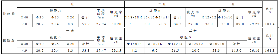 經(jīng)多次考察并做篩余曲線和顆粒級配分析后決定,將磨機(jī)二、三倉合并,原一倉倉長3.7m,二倉倉長2.7m,三倉倉長6.1m,改造后一倉倉長3.7m,二倉倉長8.8m,同時(shí)調(diào)整研磨體平均球徑及填充率,技改前后研磨體級配對比見表2。