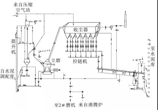 生產(chǎn)P·O42.5水泥時工藝流程是:熟料、石膏、石灰石、粉煤灰、礦渣等物料經(jīng)輸送設(shè)備輸送至各配料倉,粉煤灰從粉煤灰?guī)煜陆?jīng)輸送設(shè)備進(jìn)入生產(chǎn)系統(tǒng)。各種物料按一定比例設(shè)定,分別經(jīng)各定量給料機(jī)和輸送設(shè)備送至入磨鎖風(fēng)閥后入磨。入磨物料在磨內(nèi)進(jìn)行烘干和粉磨,粉磨后的物料經(jīng)選粉機(jī)分離,粗粉返回磨盤重新粉磨,合格細(xì)粉隨氣流直接進(jìn)入袋式收塵器進(jìn)行收集,收集下來的成品經(jīng)空氣斜槽、斗式提升機(jī)等輸送設(shè)備入水泥庫儲存;立磨吐渣經(jīng)輸送設(shè)備(設(shè)有除鐵器)進(jìn)入循環(huán)斗式提升機(jī),提升入磨后繼續(xù)粉磨。沸騰爐提供的熱風(fēng)與循環(huán)風(fēng)、冷風(fēng)混合后進(jìn)入磨內(nèi),磨內(nèi)混合風(fēng)起到烘干和提升物料的作用,出磨氣流進(jìn)入布袋收塵器;出布袋收塵器的氣體經(jīng)循環(huán)風(fēng)機(jī)后一部分經(jīng)循環(huán)風(fēng)管,作為循環(huán)風(fēng)入磨,其余氣體經(jīng)煙囪排入大氣。系統(tǒng)工藝流程見圖1。