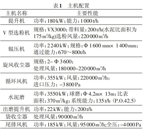 此系統(tǒng)主要由 V 型選粉機、輥壓機、旋風收塵器和球磨機組成。球磨機系統(tǒng)為開流系統(tǒng),輥壓機系統(tǒng)放風與球磨機通風共用一套收塵系統(tǒng)。流程見圖1,主機配置見表 1。