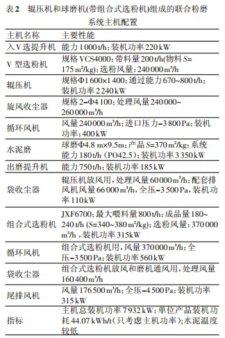 此系統(tǒng)主要由 V 型選粉機、輥壓機、旋風收塵器、球磨機和組合式選粉機組成,球磨機系統(tǒng)為閉路系統(tǒng),流程圖見圖 3,主要的主機配置見表 2。其中輥壓機系統(tǒng)設(shè)有單獨放風系統(tǒng),球磨機單獨通風與組合式選粉機放風共用一套收塵系統(tǒng)。