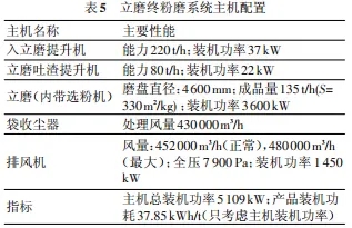 此系統(tǒng)主要由立磨、高濃度袋收塵器和風機組成,流程圖見圖 6,主要的主機配置見表 5。此系統(tǒng)其特點是:流程簡單,系統(tǒng)電耗低;廠房占地少,立磨又可以露天布置,因此土建費用相對較少;另外立磨的維修量比輥壓機要少,所以運轉(zhuǎn)率較輥壓機系統(tǒng)高。