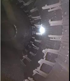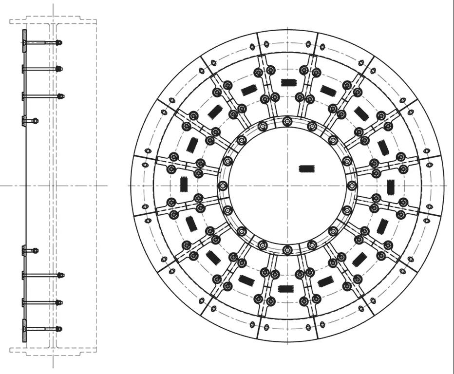 由于物料在進(jìn)入磨機(jī)前經(jīng)過了輥壓機(jī)和 V 型選粉機(jī),粒度較細(xì),研磨體直徑較小,因此,筒體襯板均采用超薄襯板,既降低了襯板質(zhì)量,又增加了筒體有效內(nèi)徑,在填充率一定的情況下,料面降低,可以增大隔倉裝置的中心環(huán),進(jìn)而改善磨內(nèi)通風(fēng)。