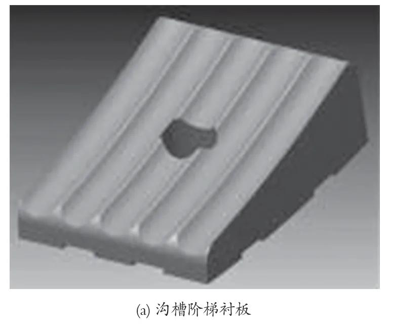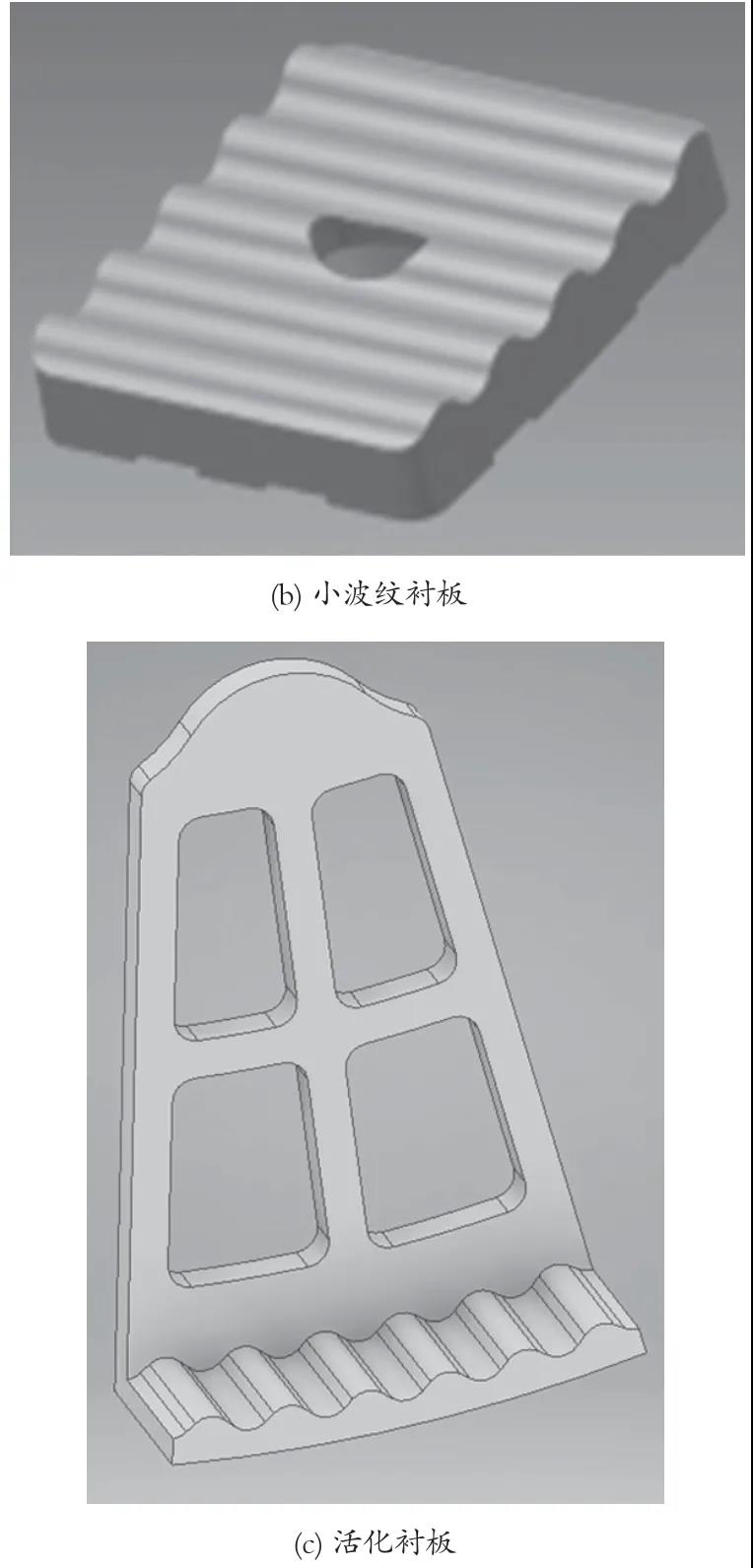 優(yōu)化前筒體襯板如圖 1 所示。一倉采用溝槽階梯襯板,其有效長度為 3.15 m,溝槽階梯襯板有磨損,階梯的高度差和溝槽可進(jìn)一步優(yōu)化;二倉采用小波紋襯板+4 圈活化襯板,小波紋襯板厚度為 75 mm,降低了有效內(nèi)徑,增加了電耗,活化襯板磨損嚴(yán)重,排列方式可進(jìn)一步優(yōu)化。