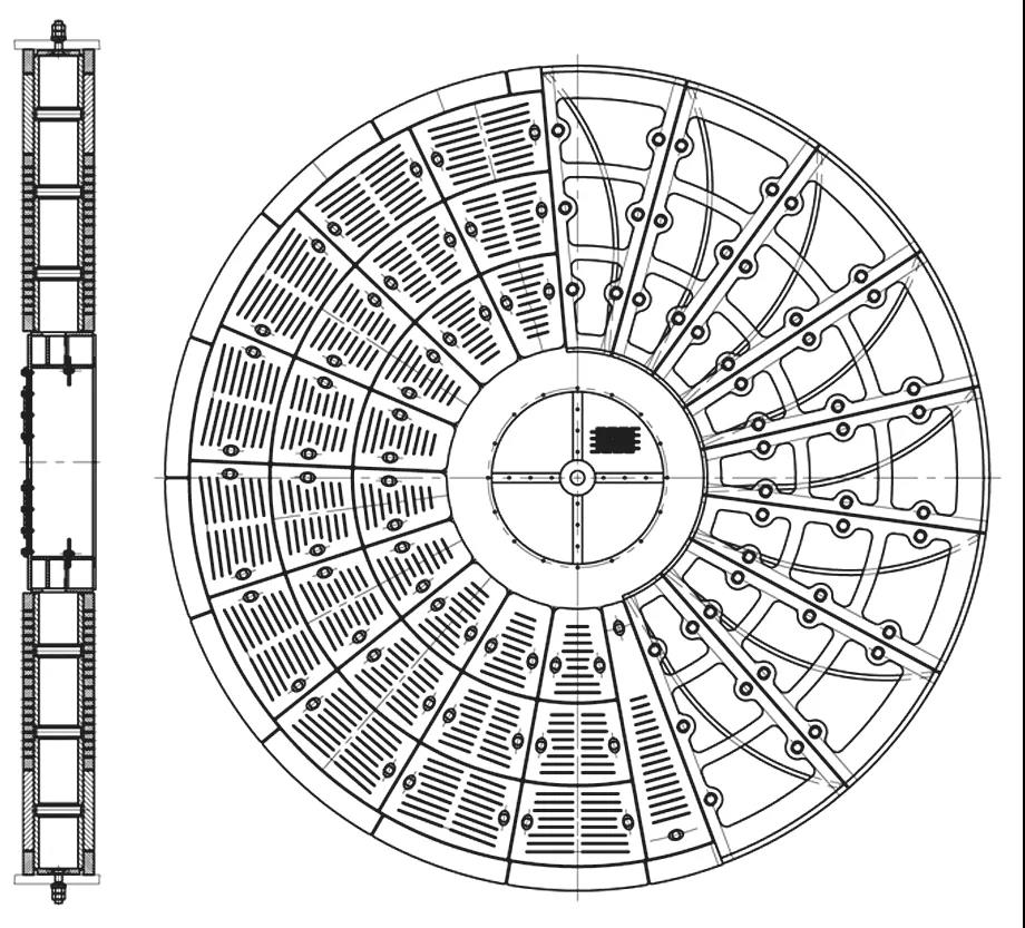 結(jié)構(gòu)方面,在考慮研磨體填充率與料面的情況下,盡可能增大中心圓的直徑,隔倉兩側(cè)采用篦板,篦縫寬度為 6 mm,通孔率為 7.8%,兩側(cè)篦板的通孔率保持一致,可改善隔倉截面通風(fēng),降低通風(fēng)阻力和中心圓處風(fēng)速。物料流動(dòng)方向安裝有閘板,現(xiàn)場可根據(jù)粉磨工藝及物料特性等來控制物料的流速,從而提高產(chǎn)品的質(zhì)量和產(chǎn)量。