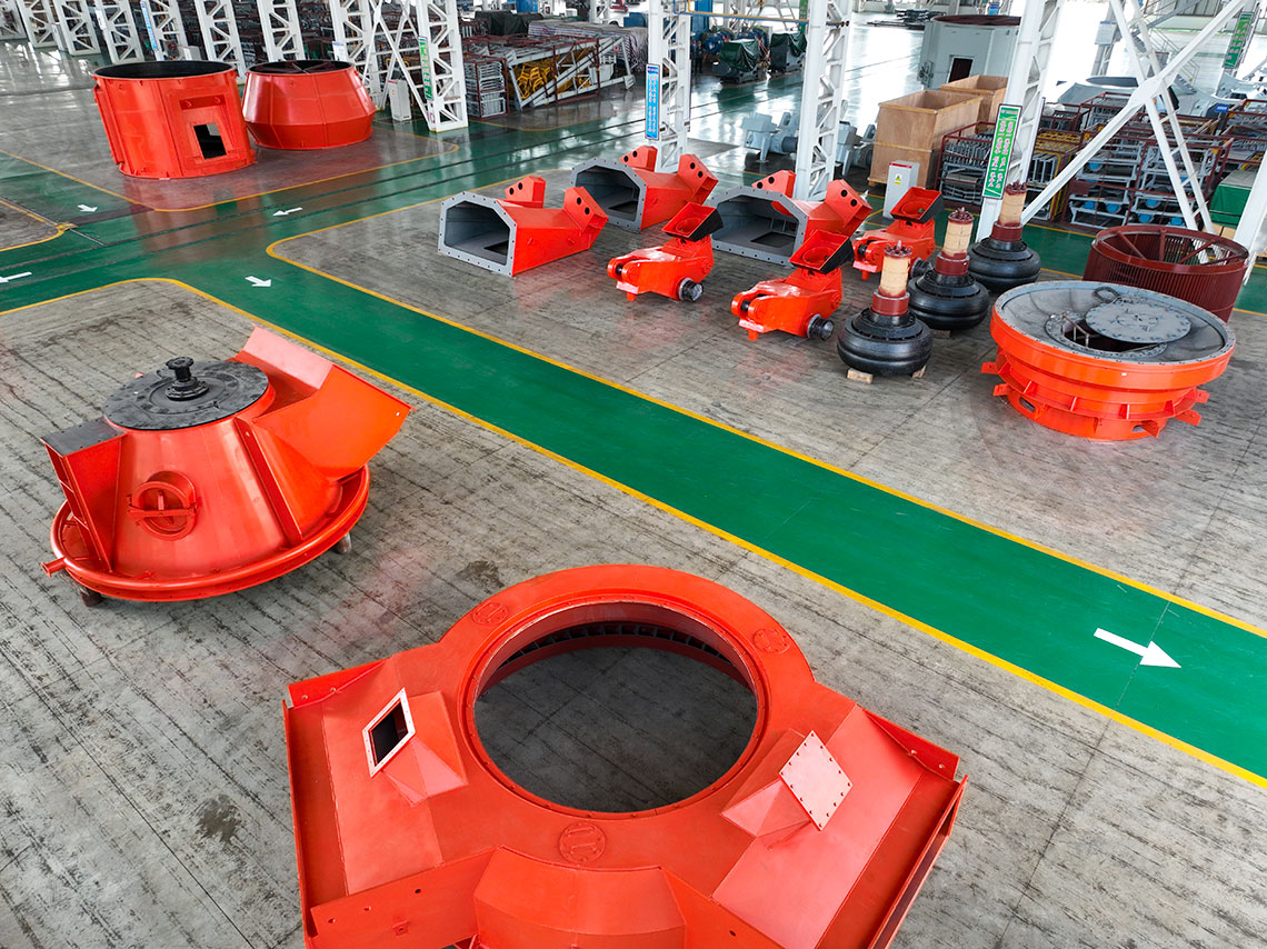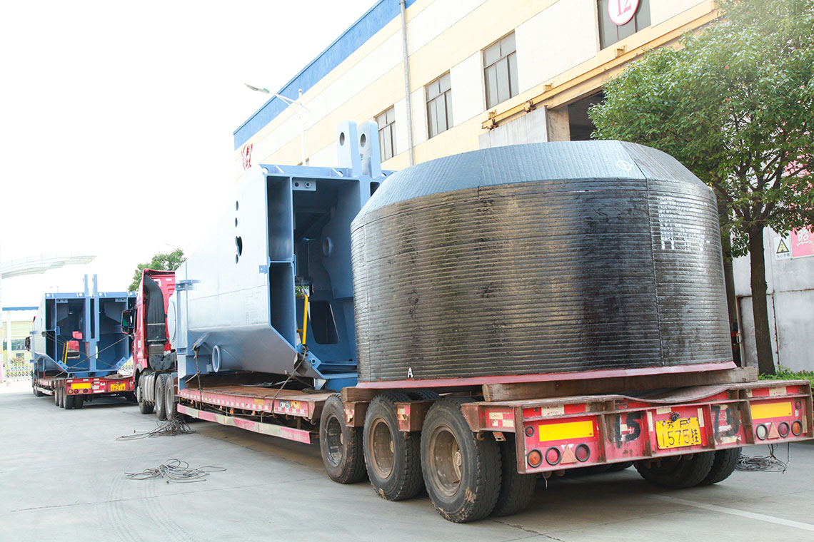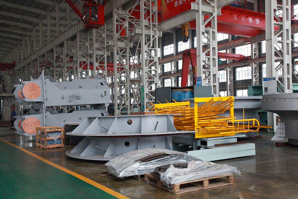 磨煤機(jī)三個(gè)磨輥由旋轉(zhuǎn)的磨盤帶動(dòng)進(jìn)行碾磨作業(yè)。入磨物料經(jīng)中心落煤管落在磨盤上后,由旋轉(zhuǎn)磨盤產(chǎn)生的離心力將其輸送至碾磨輥道上碾磨。碾磨壓力由彈簧或液壓加壓裝置產(chǎn)生,通過靜定的三點(diǎn)系統(tǒng),碾磨力均勻地傳至三個(gè)磨輥,通過加壓系統(tǒng)壓力傳至基礎(chǔ)。煤粉的干燥和輸送利用熱風(fēng)來進(jìn)行。熱風(fēng)通過噴嘴環(huán)均勻分布于磨盤四周,將經(jīng)碾磨的物料干燥并輸送至磨機(jī)上部的分離器。物料的粗細(xì)粉在此分離,細(xì)粉排出磨機(jī),粗粉重新返回磨內(nèi)碾磨。物料中的一些不可破碎物可通過磨機(jī)下部的排碴口排出。磨煤機(jī)主要由基礎(chǔ)部,減速機(jī),下架機(jī),中架機(jī),磨盤,磨輥,加壓裝置,分離器,正壓風(fēng)密封裝置,蒸汽吹掃裝置等部件組成,還配有主電動(dòng)機(jī),潤(rùn)滑油站,液壓站和密封風(fēng)機(jī)等附屬設(shè)備,另備有慢速傳動(dòng)裝置,安裝檢修專用工具,扶梯平臺(tái),煤粉分配器,速斷閥等配套設(shè)備供用戶選用。磨煤機(jī)采用液壓加壓系統(tǒng),在運(yùn)行中即可對(duì)粉磨壓力進(jìn)行調(diào)整,并具有更好的過鐵保護(hù)性能。在原標(biāo)準(zhǔn)型的基礎(chǔ)上增加了磨輥翻出裝置,并提高了磨體的抗爆能力。
